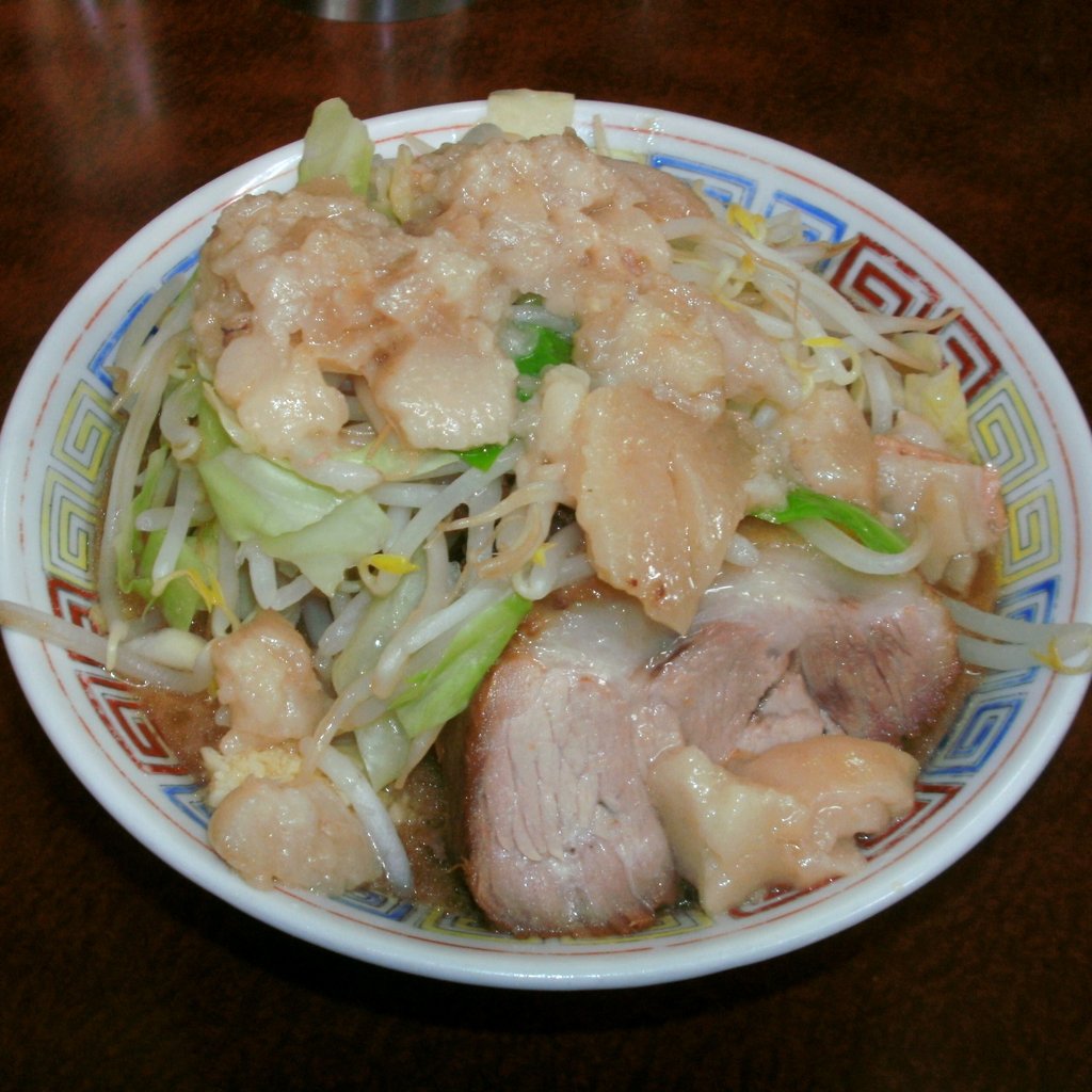 この日コチラを訪問した理由は、いつ頃からかアブラがリニューアルしたとの情報を得て、現実に食べてみたいと思ったから。従来は、ハンペンを崩しただけの白かピンク色のアブラだったのが、カエシ色に染まった茶色い味付アブラに変更になっているのだそうです。着席後20分くらいで、盛り付け担当のオバチャンからの問い掛けに、ニンニク・アブラで申告して一杯が配膳されました。