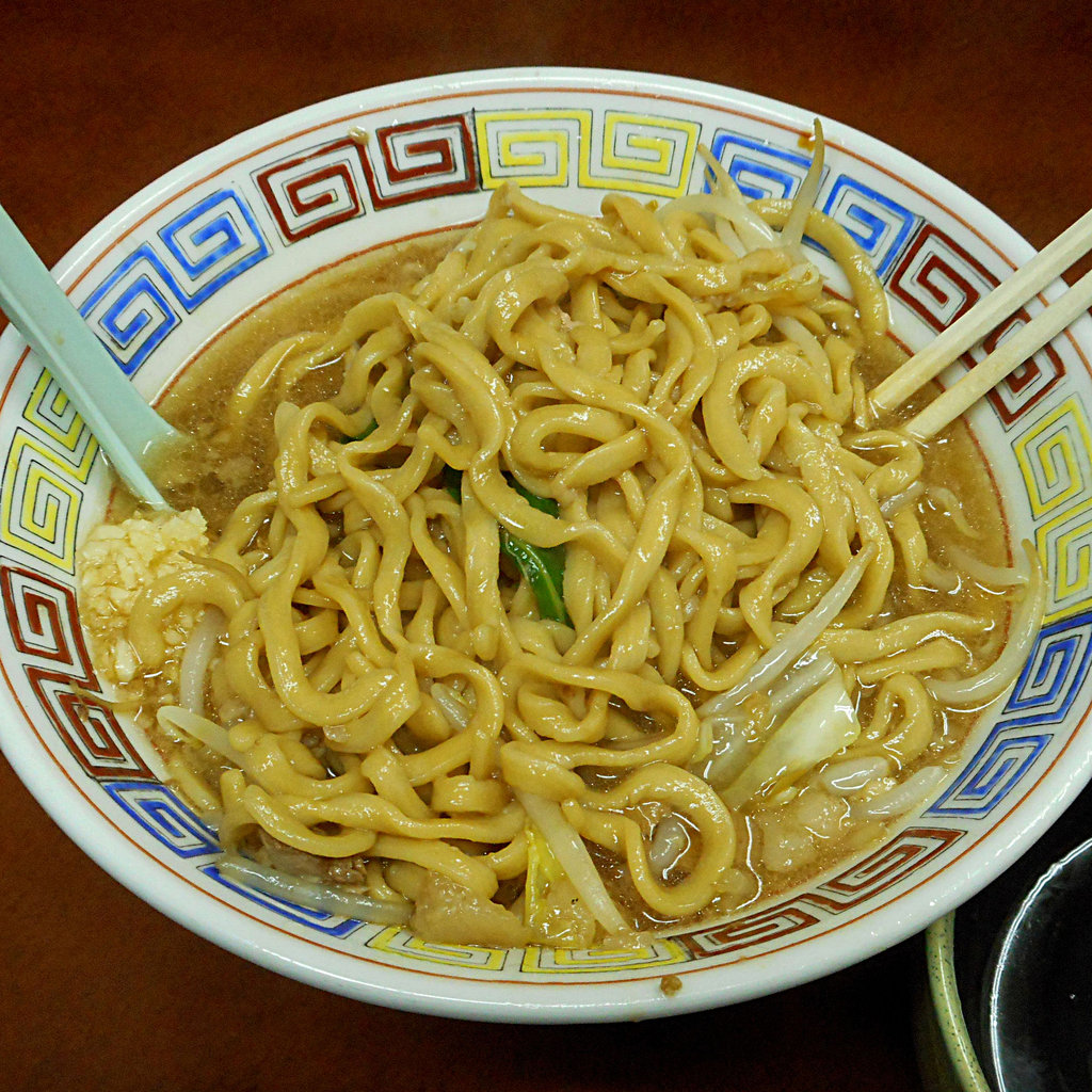 スープは甘みの効いた非乳化タイプの豚骨醤油。甘めだけどくっきりとした醤油の味が良い具合です。ヤサイ山の標高がある程度低くなったところで、その醤油が染みた太麺を引っ張り出して天地返し。ムチッとした食感で硬すぎず自分好みの麺の具合に上がっています。