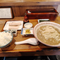 平日の夜8時過ぎ、呑みの後に訪問。先客4名、店内の券売機で標題の品を購入し、空いていたカウンター席に座り、店員さんにチケットを渡します。待つこと数分で配膳された丼には、スティック状のチャーシュー2本、メンマ、刻みネギ少々、刻み海苔少々、麺は中太ストレート麺、汁はシンプルな醤油味。グチャグチャに混ぜて食べます。具材が少し寂しく、トッピングを追加すれば良かった。